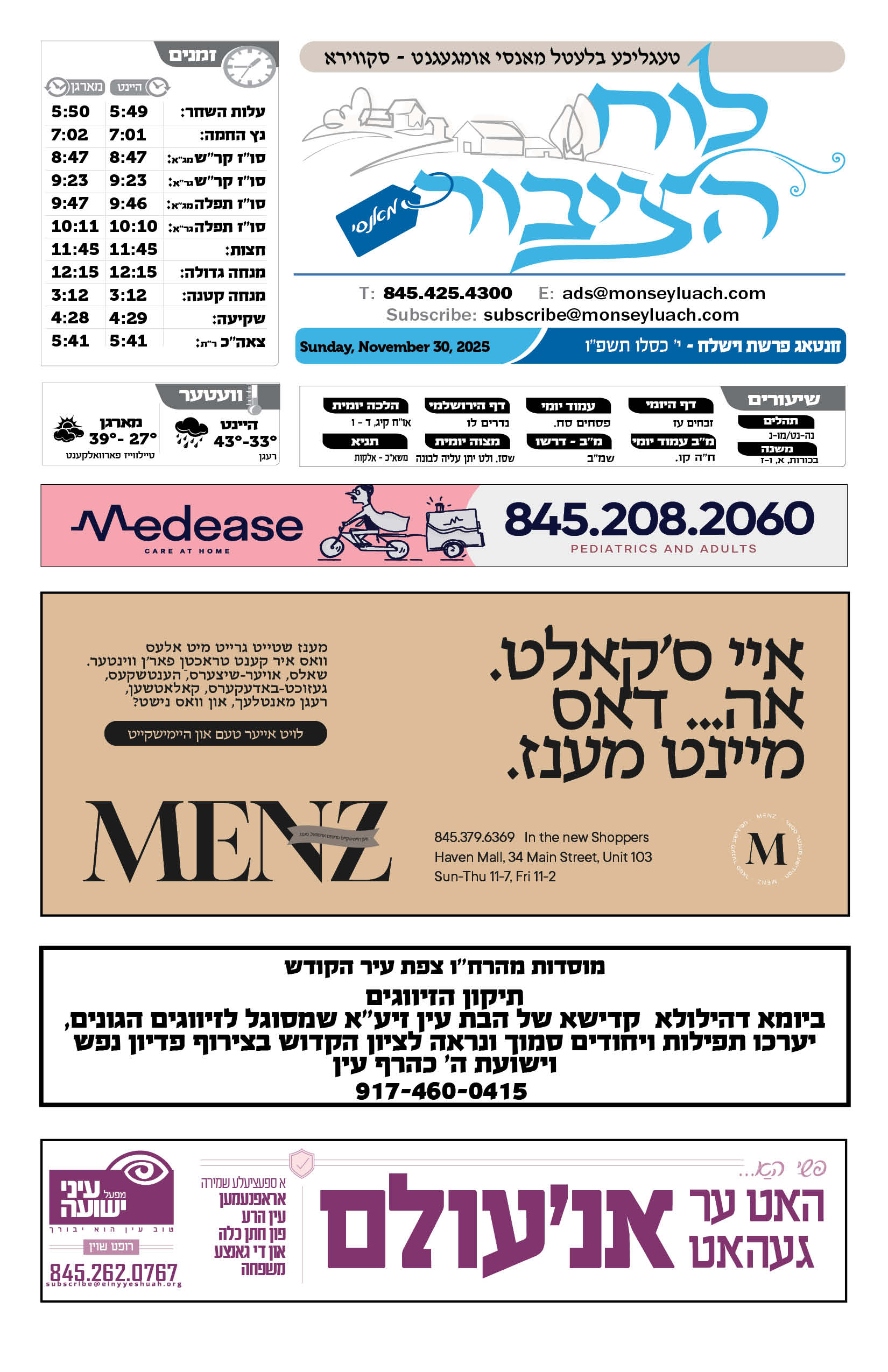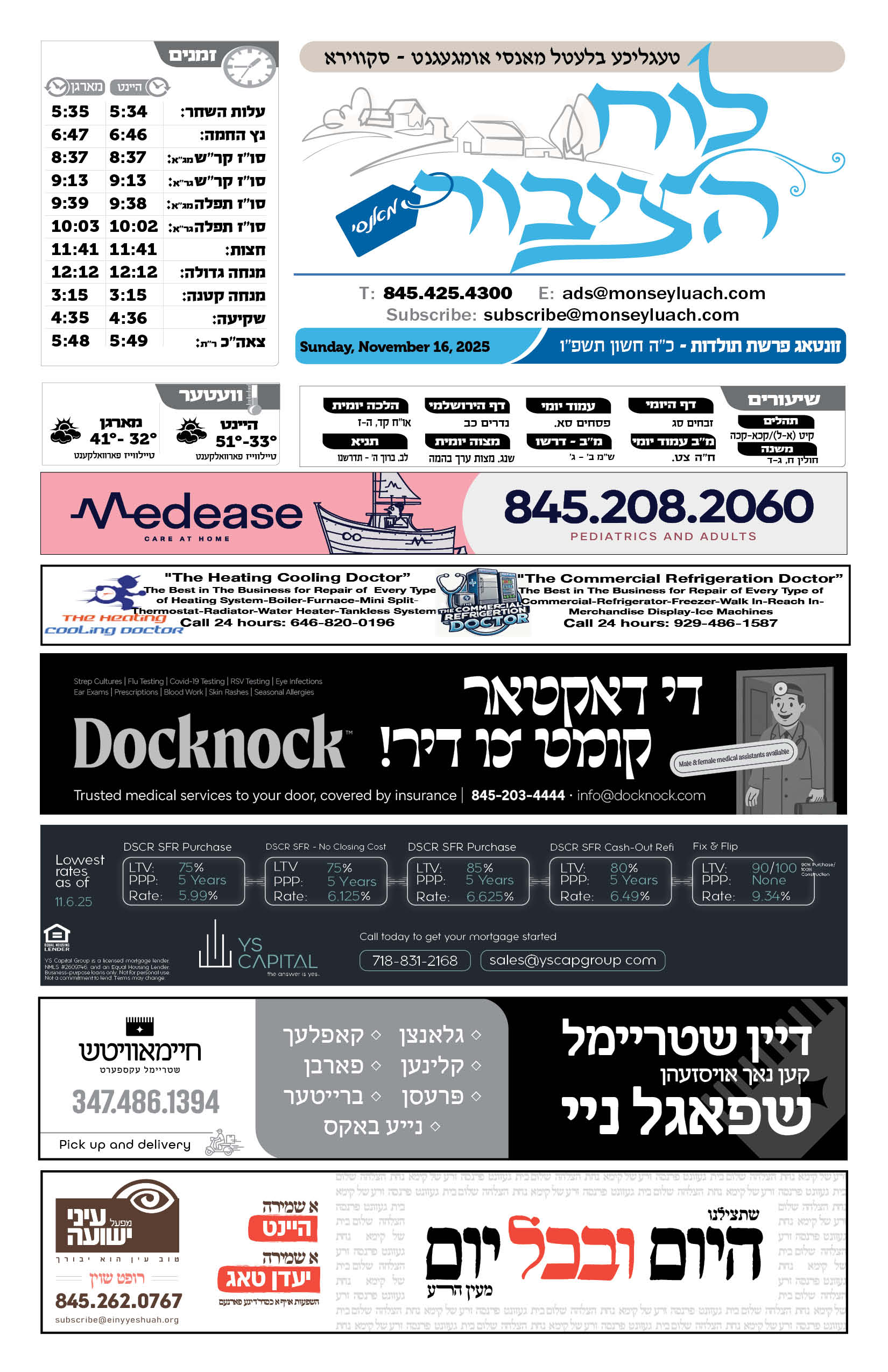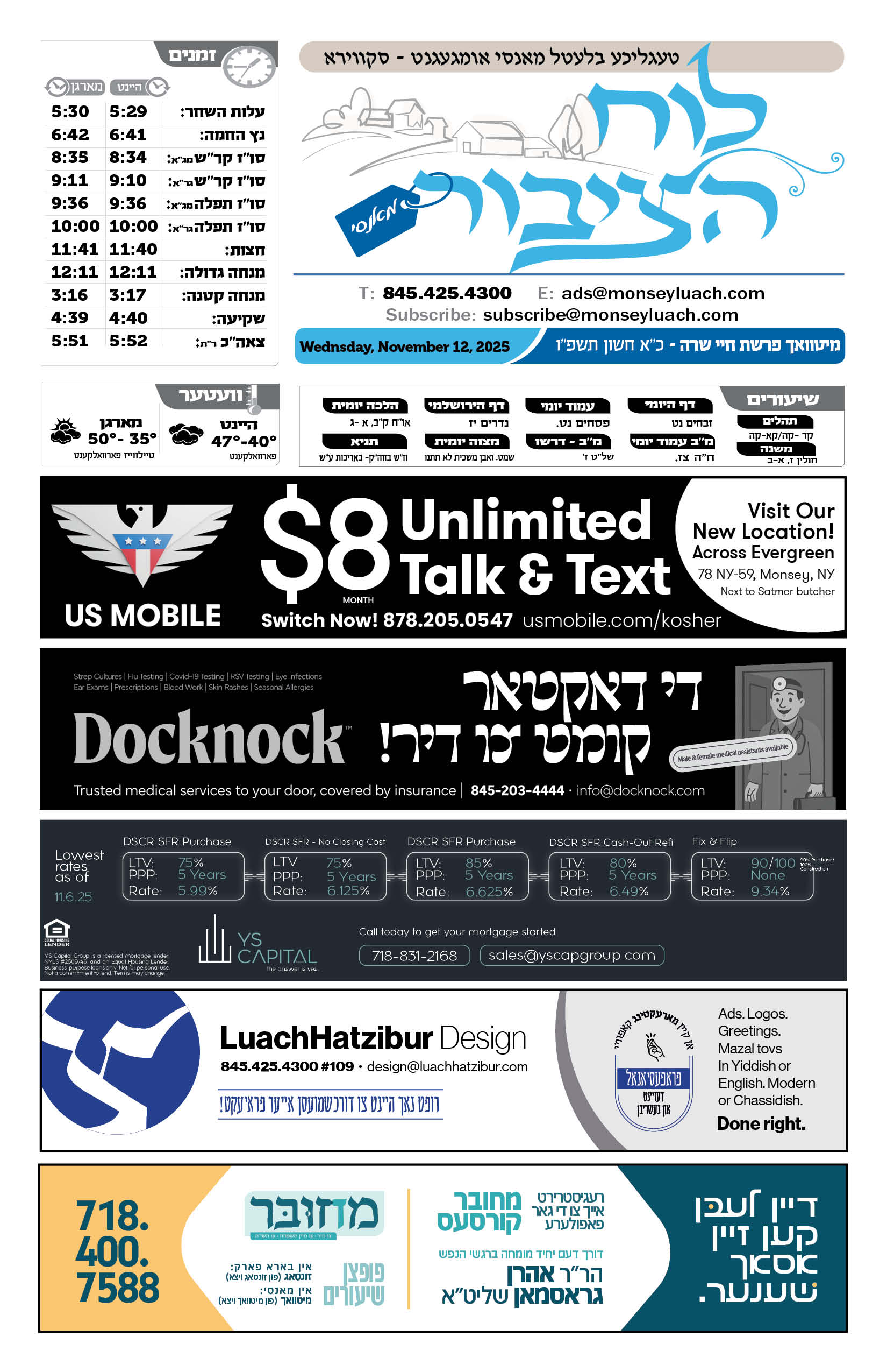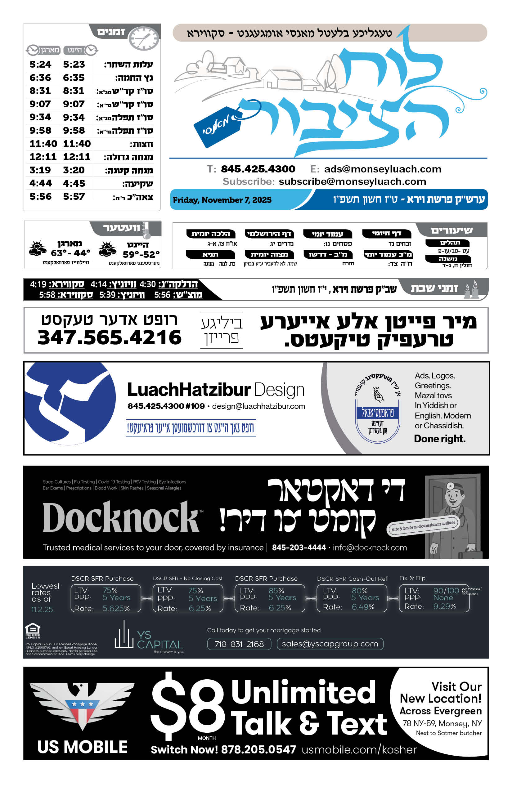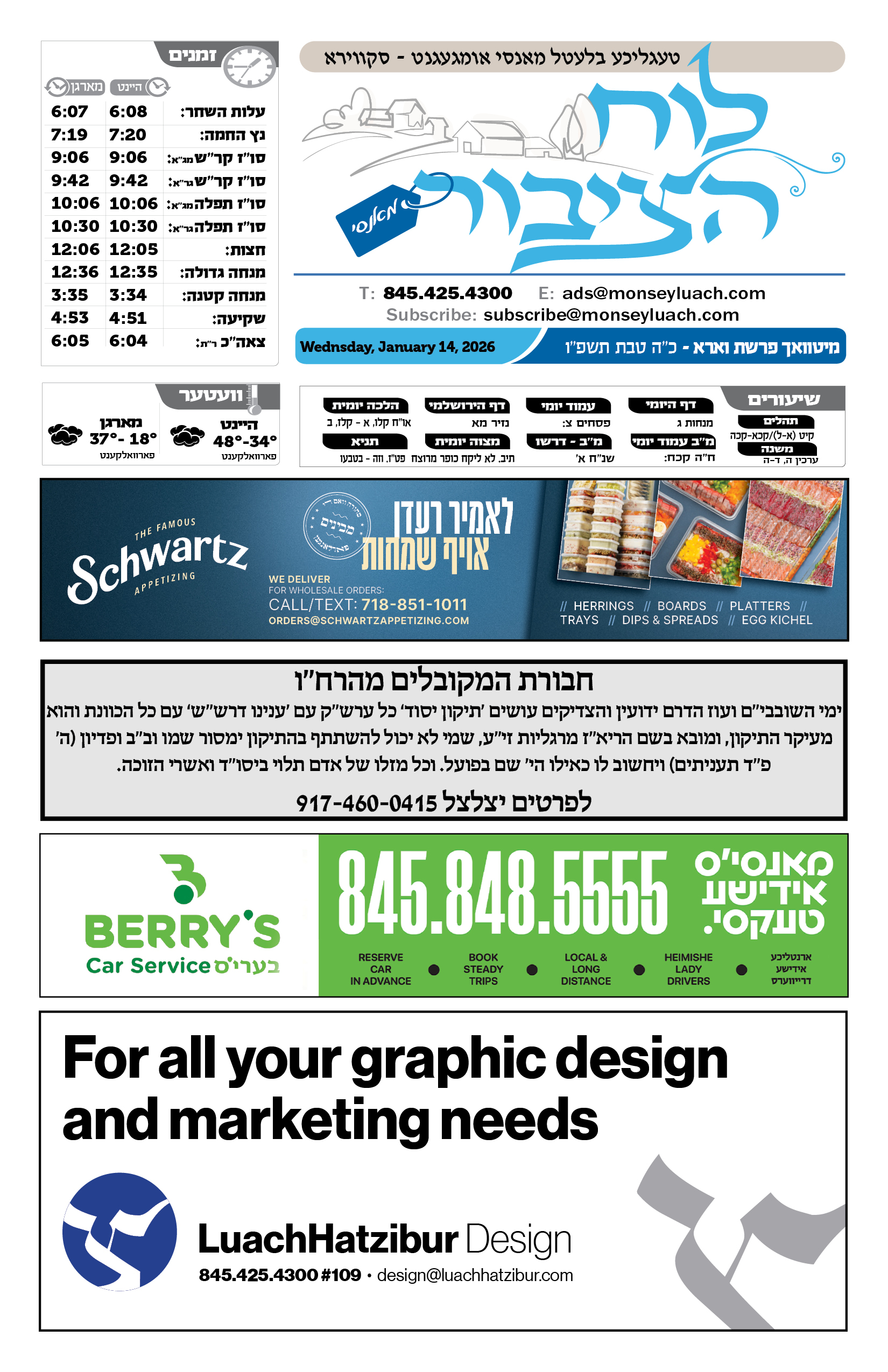 Since 2006, Luach Hatzibur has been keeping Boro Park residents informed about all important, relevant, and interesting happenings in the community. By popular demand, Luach Hatzibur launched its Monsey version in 2023 to the delight and excitement of Monsey residents.